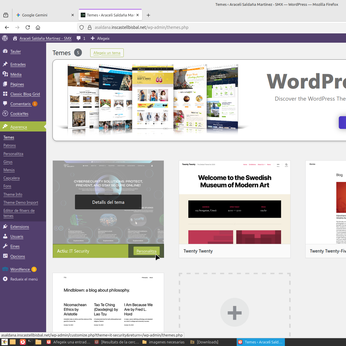 He anat des de el panell de administració a Aparença > Temes. Li he donat a Afegeix un tema. He torbat un tema que m’ha agradat que es diu IT Security. Seguidament he instal·lat i personalitzat el tema.