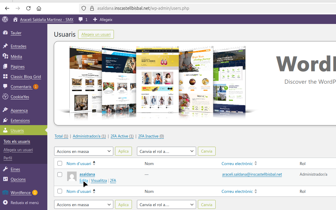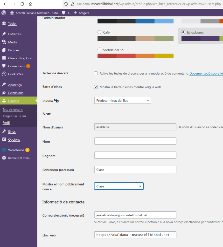 - Procediment: Des del panell d’administració de WordPress, accedim a Usuaris > Editar l’usuari. S’ha de actualitzar el camp “Sobrenom” i, a continuació, seleccionem el mateix sobrenom a l’opció “Mostrar públicament com a”