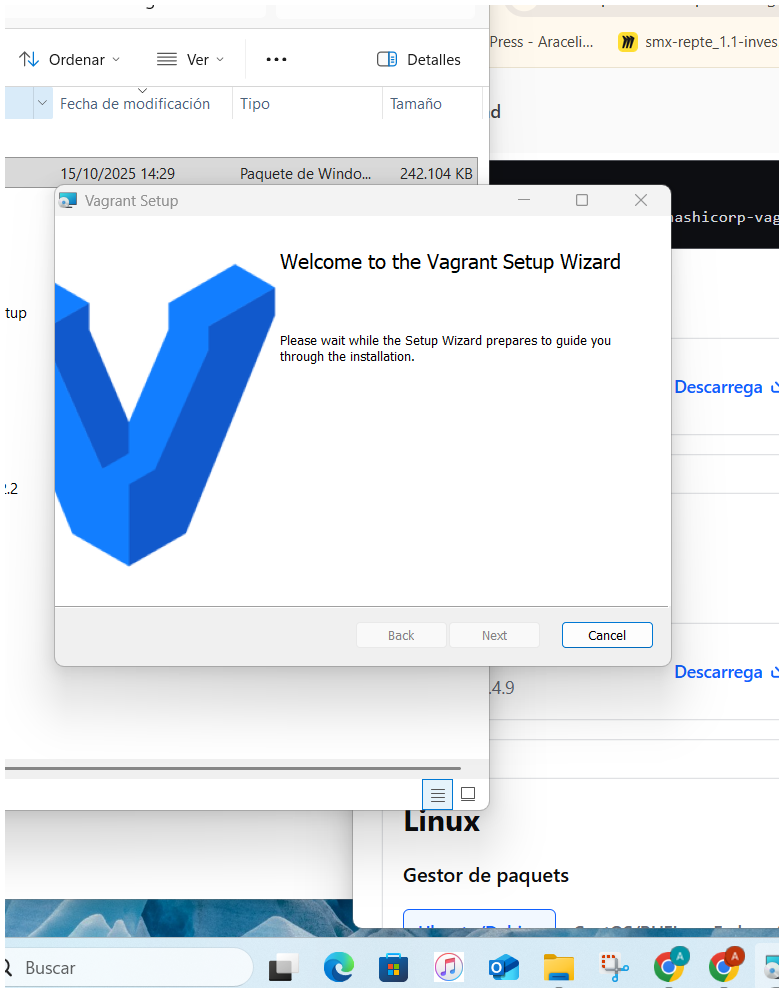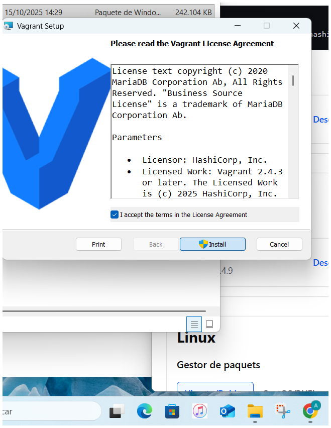 2: He anat al Web oficial de Vagrant per descarregar la versió que necessito. Un cop descarregat, he llegit els termes i condicions de ús, els he acceptat i faig clic al botó Instal·lar.