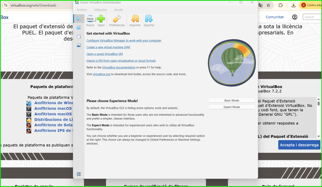 1: He anat a la web oficial de Oracle Virtual Box i he buscat la versió correcta per al meu sistema operatiu, després l’he baixat. Seguidament, he obert el fitxer descarregat i he acceptat els termes de la llicència per iniciar la instal·lació, he seleccionat el lloc de desament de l’arxiu (jo he deixat el que surt per defecte) i li he donat a Next. Ha demanat confirmació per iniciar la instal·lació. Faig clic al botó Instal·lar – Finish i obrim el programa.