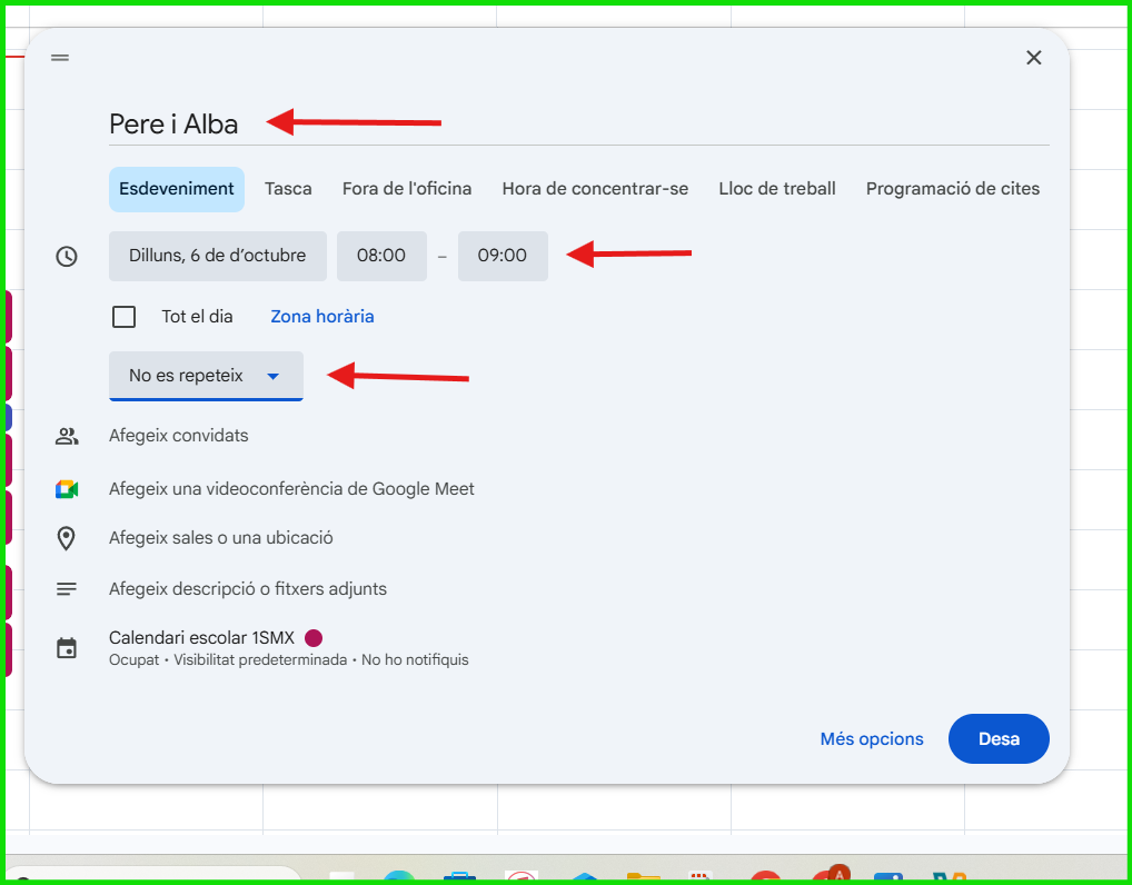 - Li posem el nom de la classe, l’horari, i per que es repeteixi cada setmana has de seleccional el desplegament de “No es repeteixi” per poder cambar-lo.