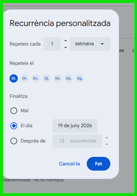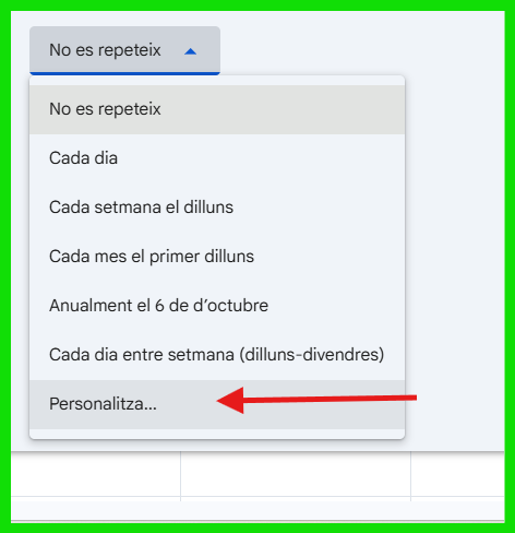 - Donem a Personalitza, i en aquest apartat podràs configurar la recurrència.