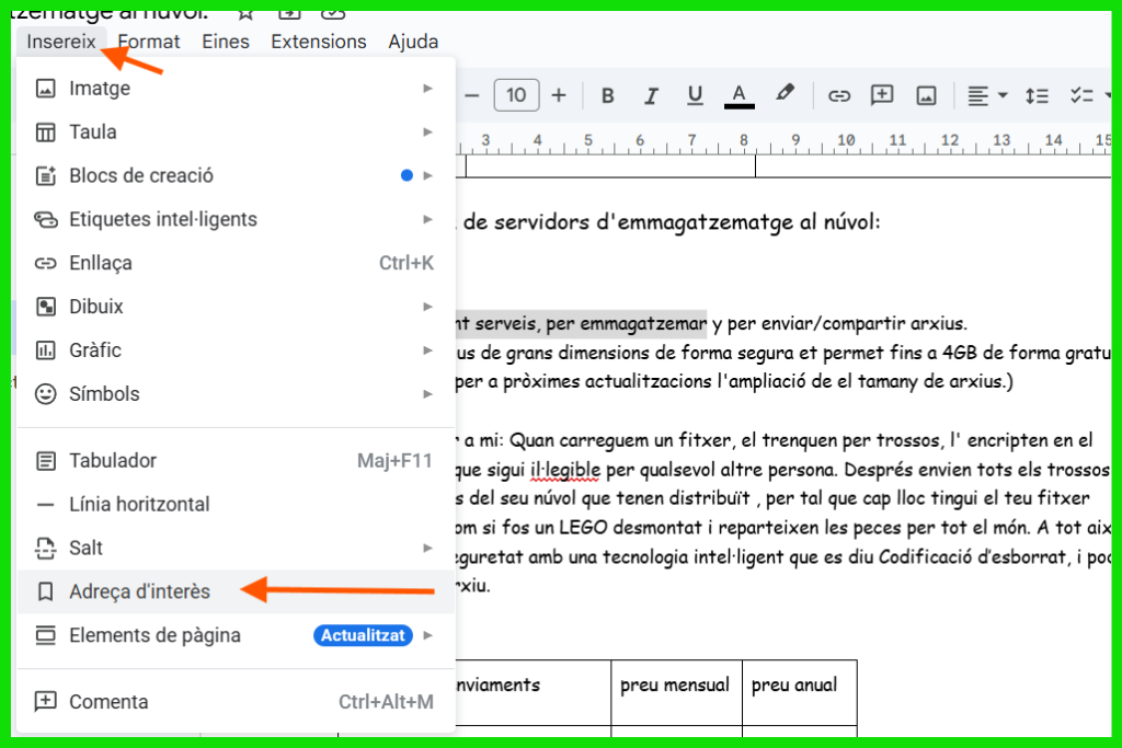 Selecciones el text que necessites marcar, a la part superior li dones a Insereix i després a Adreça d’interès.