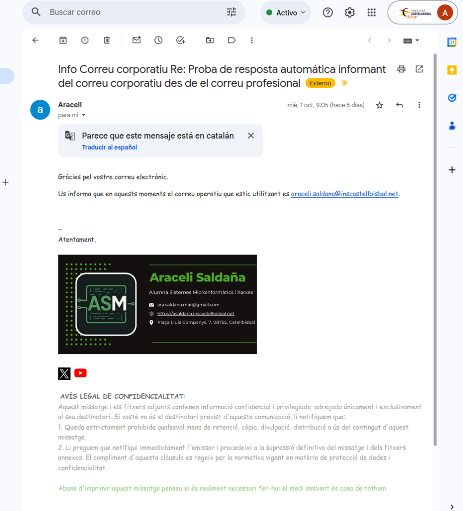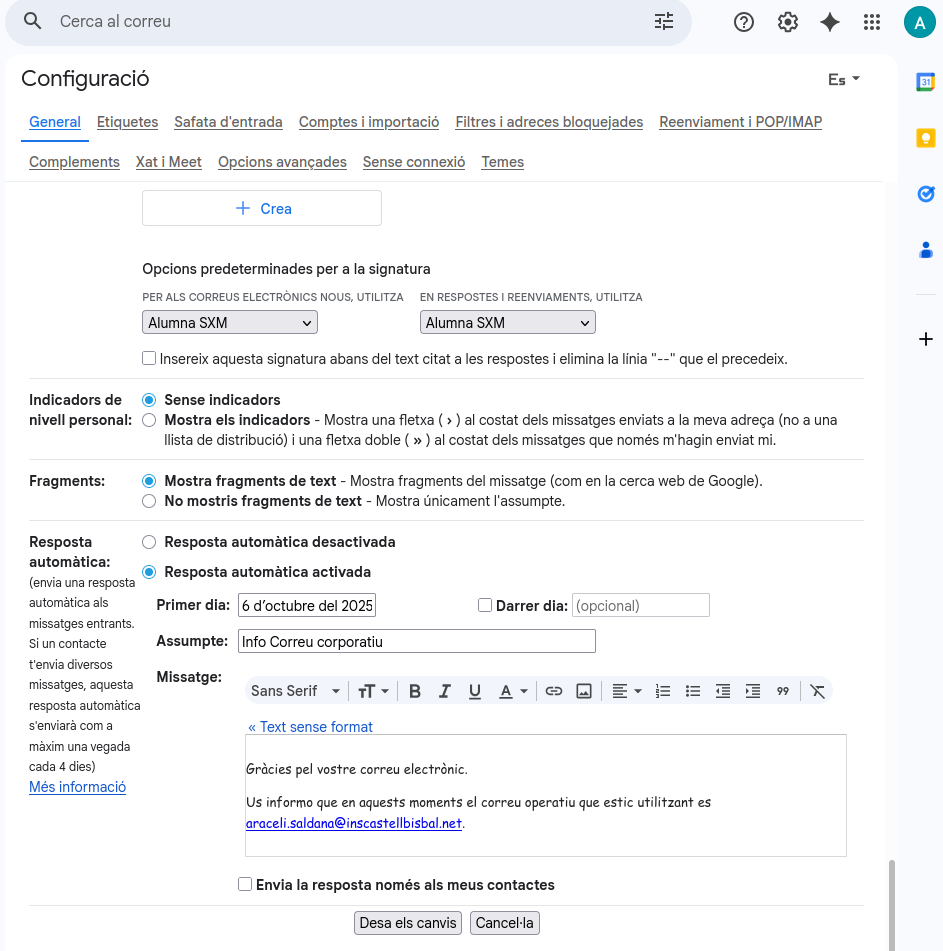 Per poder crear una resposta automàtica informant del correu corporatiu ens anem a Configuració- Mostra tota la configuració, després ens anem a l’apartat de General i baixem fins a Resposta automàtica. En aquest apartat configurem el que volem informar. I finalment activem l’apartat de Resposta automàtica activada.
