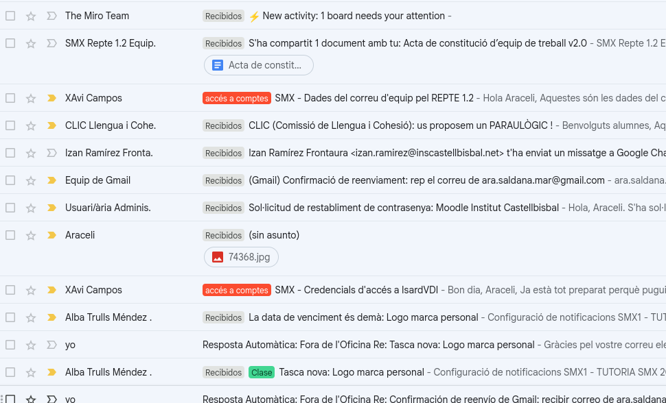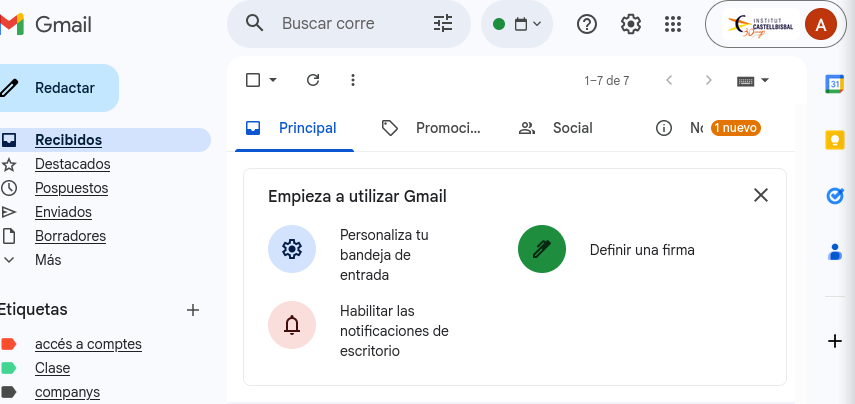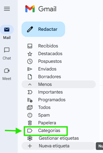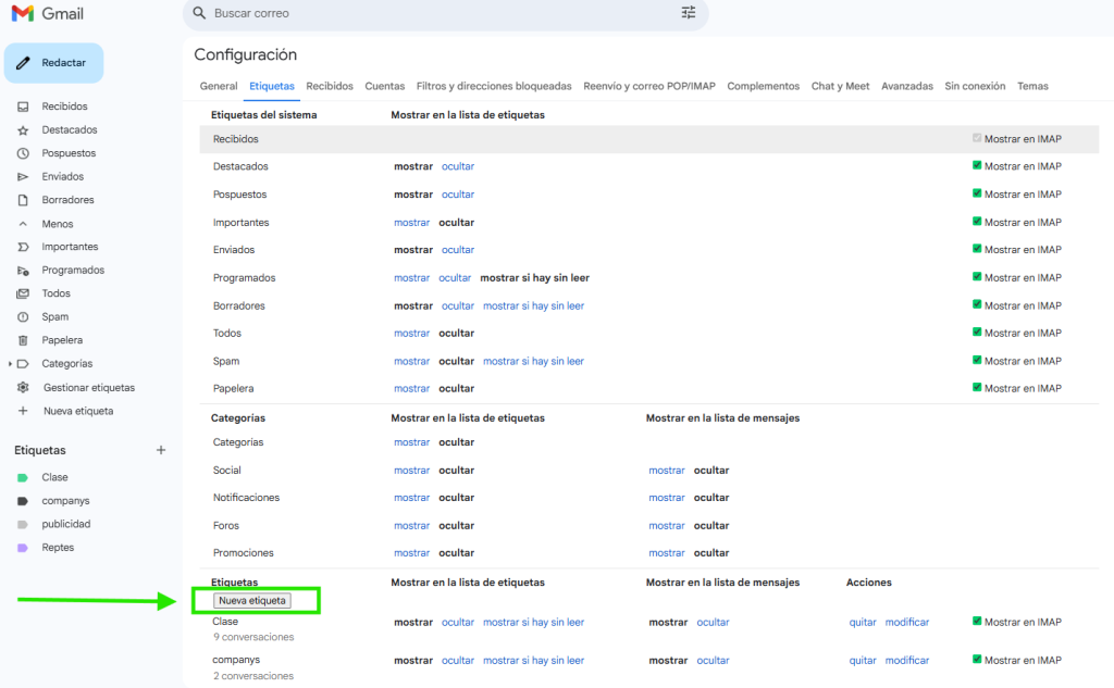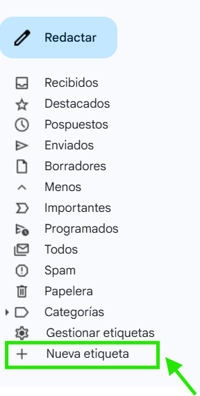 | Access it through Settings (Ajustes) | In the top menu bar, click on the Settings gear icon. Select See all settings. Go to the Labels tab. Scroll to the bottom of the Labels section and click on Create new label. Enter the desired name for your label and confirm. |