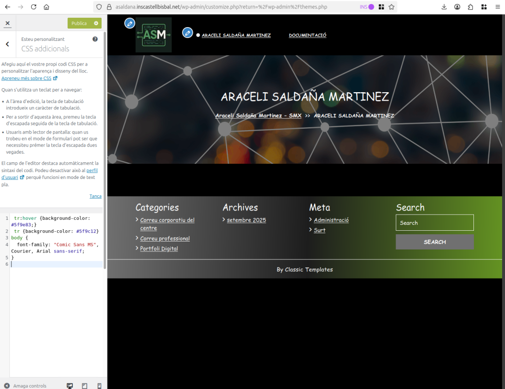 Ves a Aparença → Personalitza i després a CSS Addicional o CSS Personalitzat. Hi afegeixes el codi CSS.
